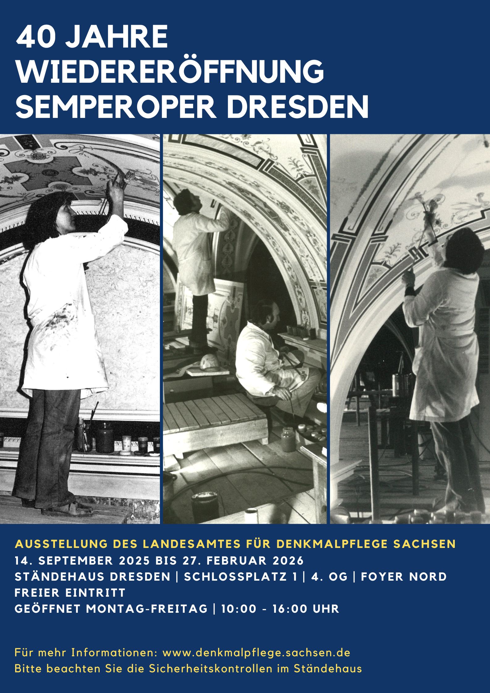 Im Foyer Nord in der vierten Etage des Ständehauses beleuchtet seit dem Tag des offenen Denkmals® eine Sonderausstellung den Wiederaufbau der Semperoper Dresden. Die Ausstellung bietet Einblicke in den Wiederaufbau und die Wiedereröffnung vor 40 Jahren. Erstmals werden Originale aus den Sammlungen des Landesamtes für Denkmalpflege Sachsen, aus Nachlässen von beteiligten Restauratoren und Malern sowie Exponate aus dem Archiv der Semperoper und des Gottfried-Semper-Clubs Dresden gezeigt, die für den Wiederaufbau von 1976 bis 1985 unverzichtbar waren. Das besondere Anliegen dieser Ausstellung ist, die aufwendige Rekonstruktion der künstlerischen Arbeiten, der Malerei und der Plastiken zu zeigen. Damals wirkten insgesamt 57 akademische Maler und 24 Bildhauer bei der Wiederherstellung mit. Aus ganz Sachsen brachten Restauratoren, Handwerker und Fachleute aus sächsischen Einrichtungen ihr Wissen ein und arbeiteten Hand in Hand. In diesem Wiederaufbauprozess entstand eine Art Malschule im Sinne des 19. Jahrhunderts, analog zur Erbauungszeit des II. Königlichen Hoftheaters 1870 bis 1878. Auf der Suche nach den farbigen Entwürfen der einzelnen Künstler stieß man gerade noch rechtzeitig im April 1979 im Keller des Archivs der Hochschule für Bildende Künste Dresden auf originale Farbstudien. Dabei handelte es sich jedoch nicht um die direkten Vorlagen für Wandgemälde, sondern um Bilder, die von den beteiligten Künstlern nach Fertigstellung der Aufträge als Belege an den Sächsischen Kunstfonds abgeliefert wurden. Dieser sensationelle Fund ermöglichte es den Restauratoren, die Bilder wieder farbgetreu herzustellen. Beispiele davon, aber auch Skizzen, Farbentwürfe und Kartons im Maßstab 1:1, sind in der Ausstellung zu sehen, ebenso originale Fundstücke der Bauskulptur und Wandgestaltung aus der Ruine sowie Gipsmodelle und Probestücke für die Rekonstruktion.
